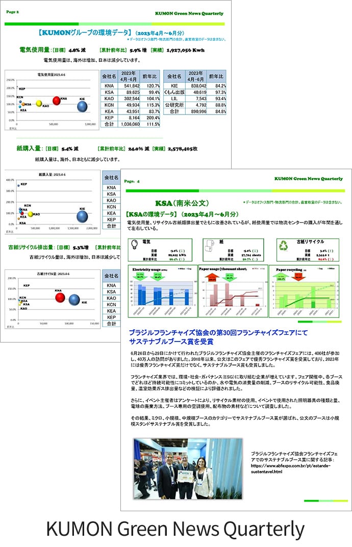 「KUMON Green News Quarterly」では、四半期ごとの地域別環境データを掲載するとともに、各グループ会社から環境活動を報告してもらい、 KUMONグループ全体で情報を共有しています。