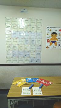 英語専用の学習席です。壁一面に英検合格証が貼ってあります。