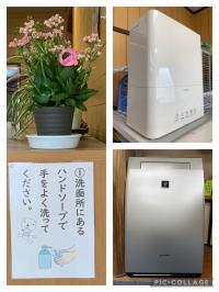 感染予防対策:消毒・体温測定。三方の窓で常時換気。加湿器・空気清浄機を使用。