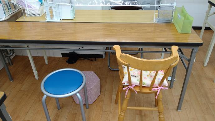 幼児さんには足置き台を用意、又はキッズハイチェア(幼児用の低い机・椅子あり)
