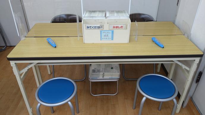 スタッフ前の対面席で頑張る子、自立席で頑張る子、一人ひとりが自分のプリントと向き合っています。