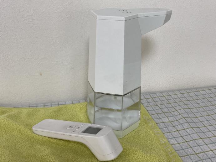 入室時、手指の消毒・非接触体温計での検温を行っています。