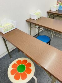 一人掛けのみで、間隔を十分にとっています。すべての机に消毒セットがあります。