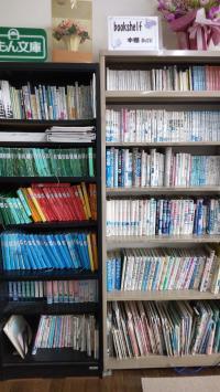本棚には多くの本と、自由に見られる教材の見本。ご父兄向けの本もあります。