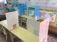 小さなお子様用の机もあります。。二人用の机を一人で使用。仕切りをつけました。