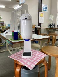 入口に体温・消毒設置しています。幼児さんも自分で簡単に体温を計れます。