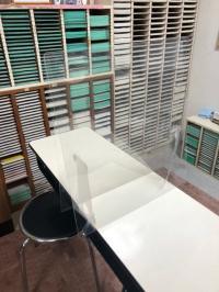 生徒席にもパネルを設置しています。自分が使用した机を消毒して学習終了しています。