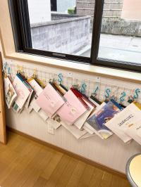 待合スペースには教材に出てくる本がたくさん。本好きに育てます。
