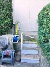 駐車場横のこちらの階段から建物の裏へお回りください。入口は裏にございます。