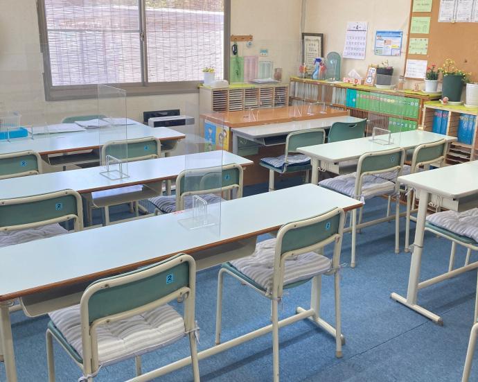 明るい教室で集中して学習できます。背もたれ付きの椅子で安心です。