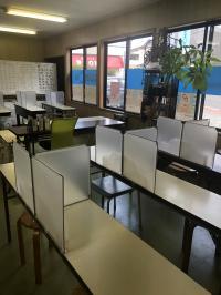 まず私と今日の学習について話をしてから着席。教室では、4つのコーナーに分かれて学習します。入会間もない生徒さんや、ここは大切に学習してほしいと思うプリントの生徒さんは、スタッフがそばで見守りながら学習します。