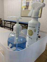 入室したらすぐ消毒。その後、体温測定器にて体調を確認しています。