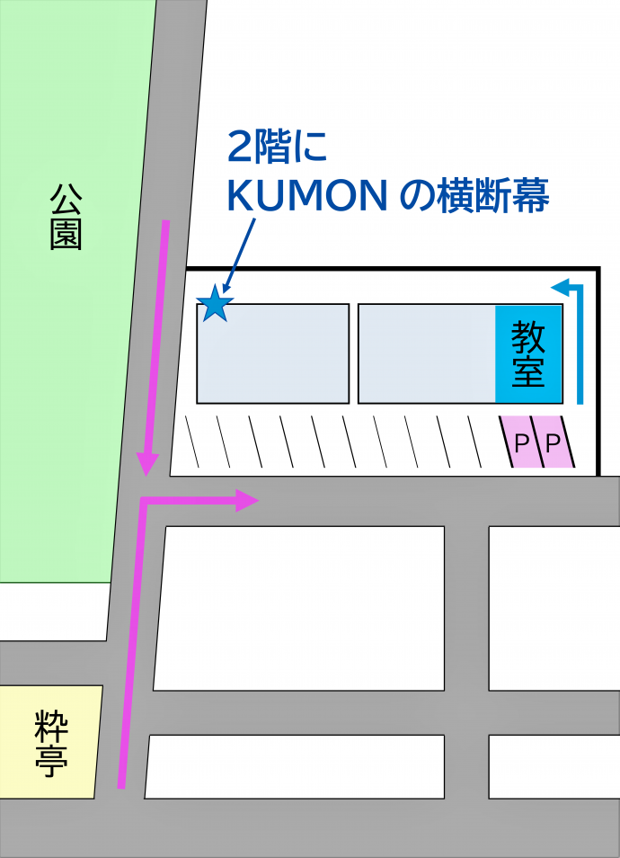 国道50号線(片側2車線)からは、粋亭に入るように左折。公園向かい側の建物です。
