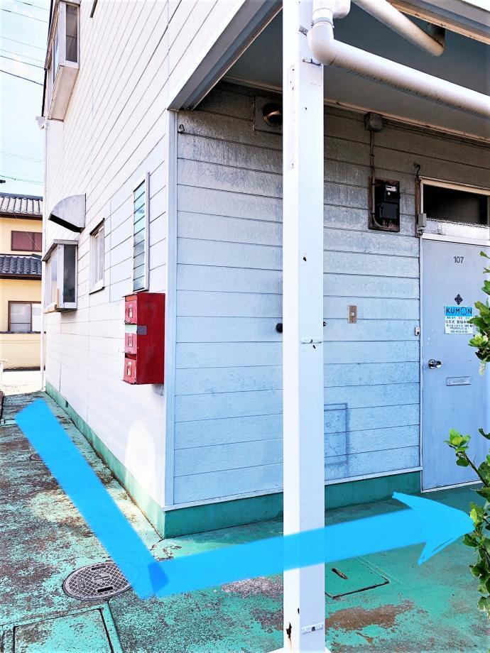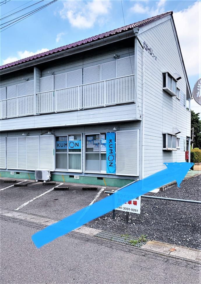 お車は、ここへ。建物のわきを通り、入口は、裏手になります。