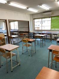 教室の内観です。感染防止のため学習机の間隔をあけています。
