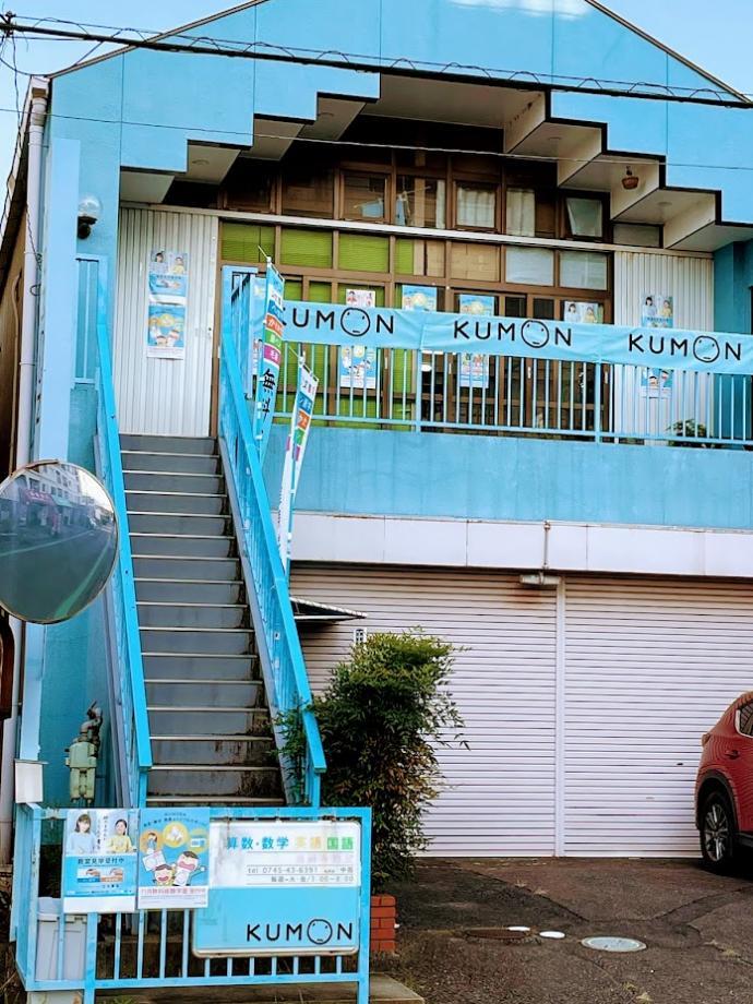 当麻寺駅から北に徒歩約3分で、くもんブルーの壁が見えます。