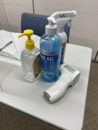 入室時の検温と消毒、教室備品の除菌を徹底しています。