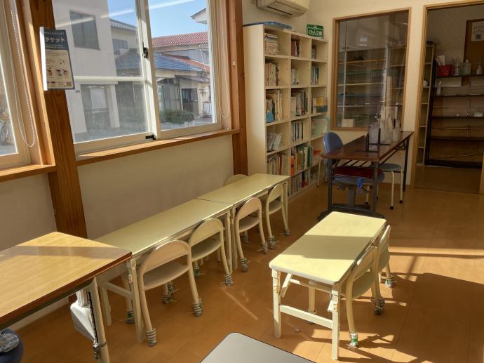 幼児の学習に対応した机と椅子、スタッフがサポートします。