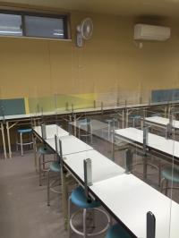 教室内観です。すべての席に飛沫防止パネルを設置しています。
