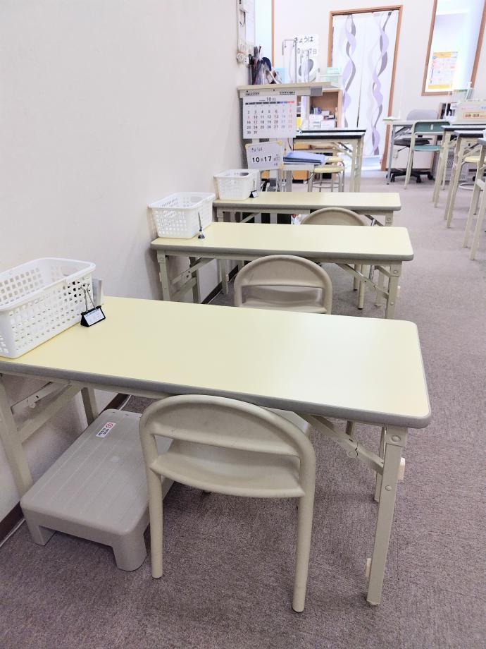幼児席には小さいお子さま用に足台も。良い姿勢で落ち着いて学習していただきます