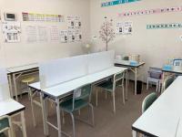 席と席の間隔をとり、机にはパーティションを立てています。