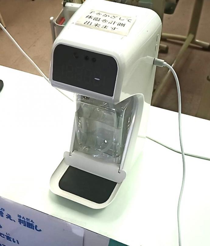 入り口で、手指の消毒をします。