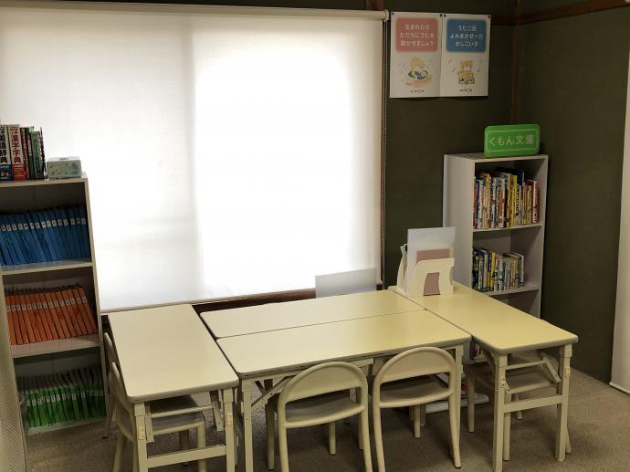 教室奥には、幼児さんの学習スペースや公文の推薦図書が並べられた本棚があります。