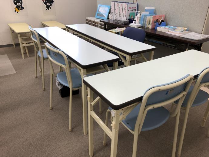 小さなお子様は、スタッフといっしょに学習します。床に足がつく、机と椅子です。