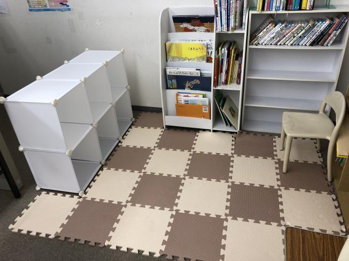 待合コーナー。本を読みながら、お迎えを待ちます。ランドセルを置く棚もございます。