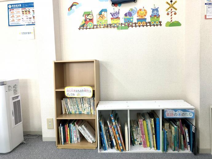 幼児さんも取り出しやすい位置に絵本や児童書を設置。英語の本もたくさんあります。