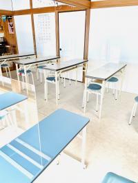 正しい姿勢で集中学習。低学年席、一般席も揃えています。アクリルパネル全席設置。