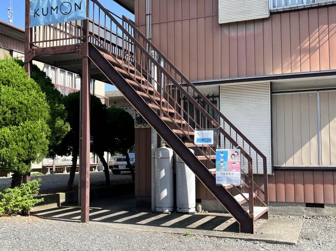 外階段を上がって突き当りの部屋が教室になっております。