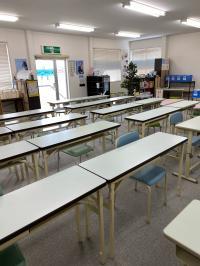 小学校の教室程度の広さがあり、換気扇も二方向に設置、除菌も行っております。