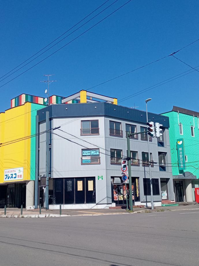 八雲駅前交差点にあるグレーの建物2階です。