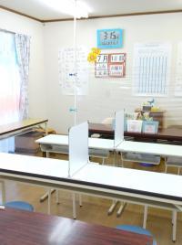 明るく清潔な教室です。パーテーションを設置して、集中しやすいようにしています。