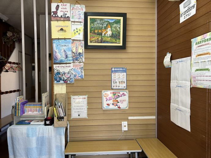 入り口の待合スペースに毎月変わる絵本を置いています。奥に図書室もあります。