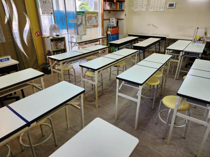 お席は密にならないように気をつけて学習しております。英語学習コーナーもあります。