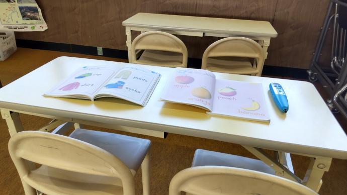 幼児の机で、E-Pencilを使い英語学習をしています。