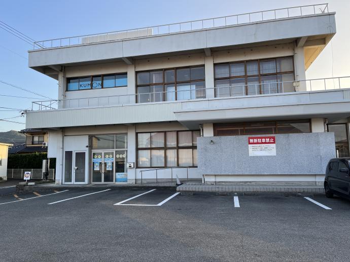 こちらの建物の二階です。広い駐車場もあります。小学校から徒歩12分くらいです。