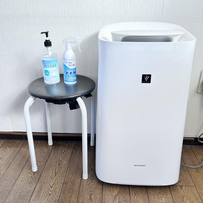 手指用アルコール消毒、机椅子用の非電解次亜塩素水、空気清浄機稼働中です。