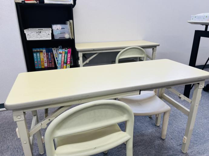 幼児さんは足がつく机で学習しています。教具もあるので楽しみながら学べます。