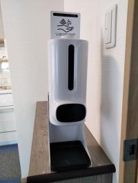 入室時は、自動温度測定消毒器で手の消毒 検温をお願いします。