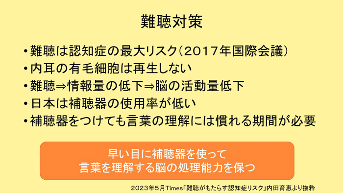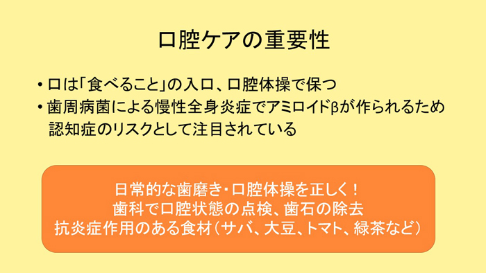 認知症は、アミロイドβ(ベータ)というたんぱく質が症状が出る20年ぐらい前から脳に溜まってきて、それが糸玉みたいになって、脳の細胞を障害してしまうことで発症するとされています。新しい薬は、免疫細胞が固まる前の糸くずの状態で除去してくれるというもので、3年ぐらい発症を遅らせることができます。適応が限られているのですが、早く見つけ出して、適応のある方はこのような医療につなげるという努力もしています。