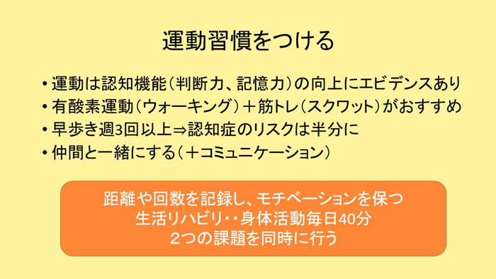 廃用性変化、すなわち脳を使わないことによる変化というのは想像以上に大きいんです。使わないものはいらないものと脳が判断します。使えば再び活性化します。特に家事は体のいろんなところを使うので、生活リハビリとして使えます。いかに楽しくやる気スイッチオンできるかですね。筋トレやウォーキングをしたらカレンダーに丸をつけるなど、成果が見えるようにしておく。そうすると続けやすいかなと思います。
