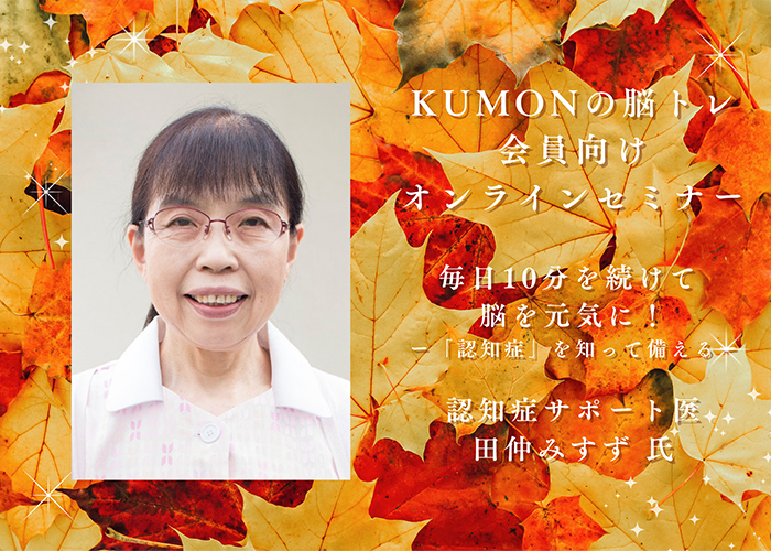 関連リンク もり内科クリニック院長/布施医師会(東大阪市)理事 田仲みすず先生(前編)|KUMON now!スペシャルインタビュー 「KUMONの脳トレ」スタート記念―川島隆太教授オンラインセミナー報告2023|KUMON now! 新サービス「KUMONの脳トレ」とは?|KUMON now! 川島隆太教授オンラインセミナー報告|KUMON now! 「第10回 日本医師会 赤ひげ大賞」功労賞に田仲みすず先生|KUMON now! 学習療法センター KUMONの脳トレ