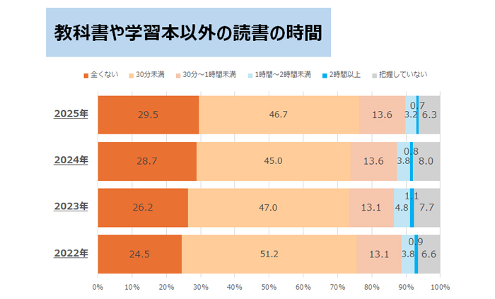 学校の教科書や学習のための本以外の読書の時間(新聞、雑誌、小説、マンガなど)について聞きました。「全くない」は29.5%、「30分未満」が46.7%となりました。「全くない」は年々増加傾向にあります。