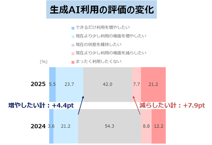 家庭学習における生成AIの利用についての評価を聞いたところ、「できるだけ利用を増やしたい」が5.5%、「現在より少し利用の場面を増やしたい」が23.7%と、合わせて29.2%となり、昨年より4.4ポイント増加する結果となりました。「まったく利用したくない」は21.2%、「現在より少し利用の場面を減らしたい」は7.7%と、合わせて28.9%となり、昨年より7.9ポイント増加する結果となりました。