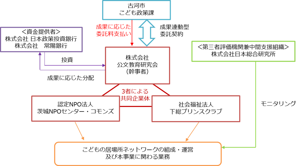 事業体は、KUMON、認定非営利法人茨城NPOセンター・コモンズ(代表理事:横田 能洋)、社会福祉法人下総プリンスクラブ(理事長:宇田 明良)、により構成。資金提供者である株式会社日本政策投資銀行と株式会社常陽銀行による、資金調達を受け、各事業者の強みを生かしたこどもの居場所支援事業を推進していきます。