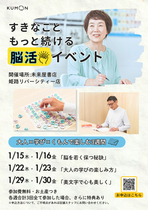 2025年10月24日、未来屋書店姫路リバーシティー店(兵庫県姫路市)はリニューアルオープンに際し、「地域の方々に貢献したい」という想いのもと、KUMONグループのシニア向けコンテンツを体験できるスペースを設けました。今回は、KUMONグループ3社が連携し、「健康で、好きなことを楽しむシニアライフ」がコンセプトになるイベントを開催します。