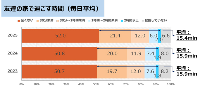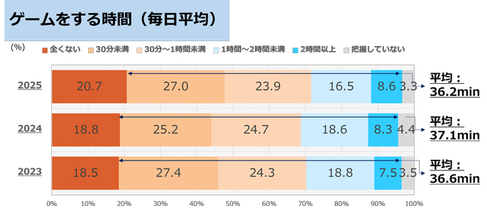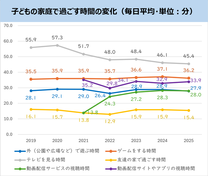 子どもの家庭での過ごし方について聞きました。最も多かったのは、「テレビを見る時間」で1日平均45.4分でした。次に「ゲームをする時間」が1日平均36.2分、「動画配信サイトやアプリ(YouTube、TikTok、ニコニコ動画など)の視聴時間」が1日平均33.9分と続きます。
